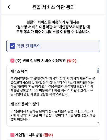 서비스 약관 동의 페이지 표출 시, 동의 후에 앱 사용 가능합니다. (주선사 로그인, 차주 로그인 동일) _최초 1번 동의 필요