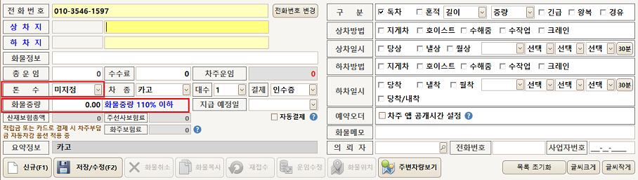 오더 입력창 희망차량 톤수 변경 시, 화물중량 데이터가 초기화되는 기능이 제거되어, 입력된 데이터가 그대로 유지되도록 수정되었습니다.