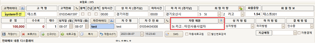 – 오더등록창의 차량제원에 근로자유형 데이터가 추가로 디스플레이됩니다.