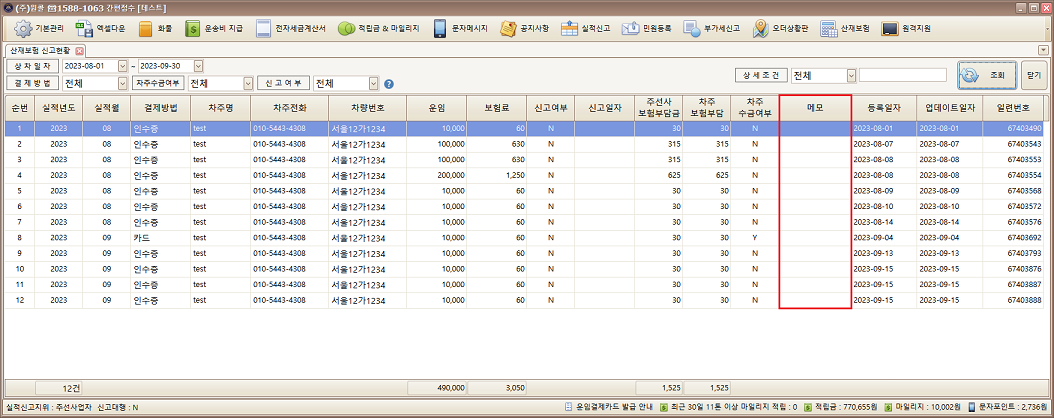 조회 리스트에 메모 컬럼이 추가되었습니다.(마우스 우클릭 목록초기화 필요)