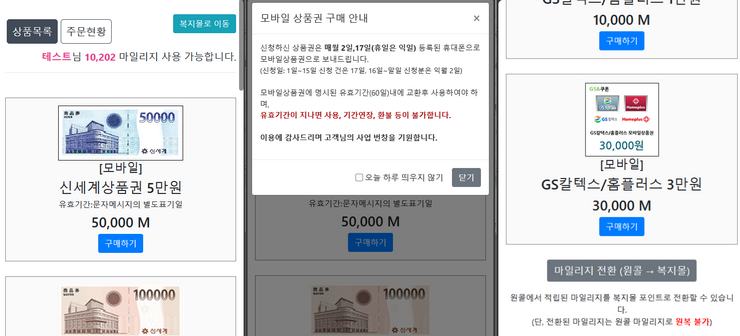 마일리지 전환 버튼의 위치가 페이지 하단으로 이동되었고 명칭이 “마일리지 전환 (원콜 → 복지몰)”로 변경되었습니다.