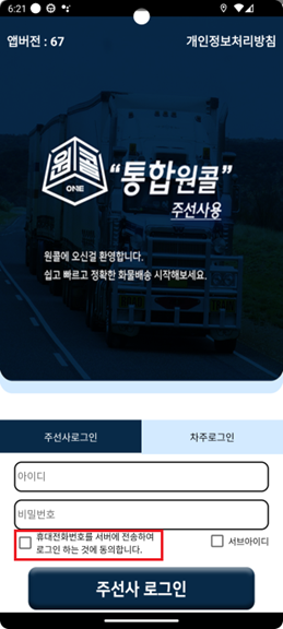 주선사 계정으로 로그인 시 휴대전화번호제공에 동의해야 로그인이 가능합니다. (플레이스토어 요구 정책)