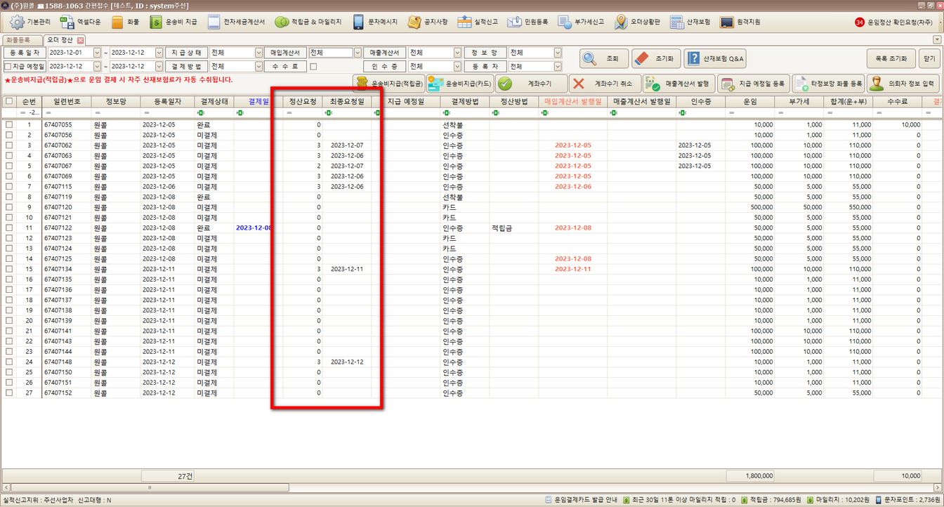 오더정산에 정산요청 및 최종요청일 필드가 추가되었습니다. (컬럼 설정 초기화 필요)