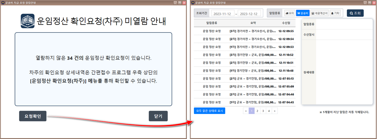 로그인 후 운임정산 확인요청(차주) 미열람건이 있으면 아래 팝업창이 표시됩니다.