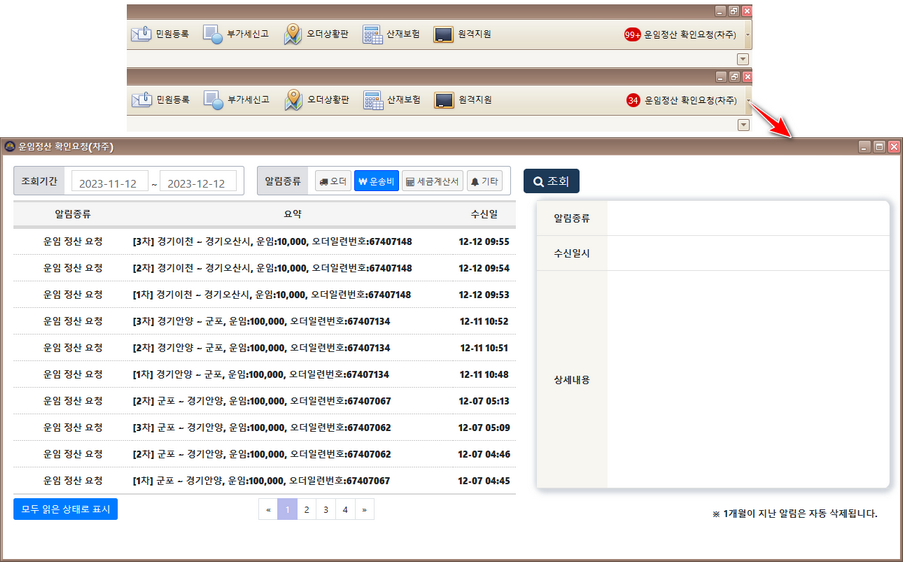 프로그램 우측 상단에 운임정산 확인요청(차주) 미확인 건이 표시됩니다.