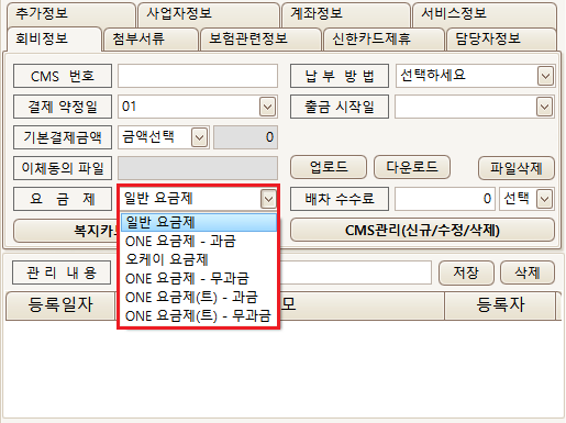 회비정보탭의 요금제 항목의 정렬순서가 변경되었으며, 해당 항목 선택에 따라 기본결제금액이 자동으로 세팅됩니다.