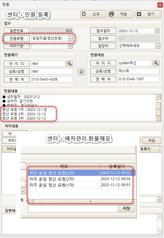 차주가 운임 정산 확인요청을 하면 해당 화물의 화물메모와 민원이 아래와 같이 등록됩니다.