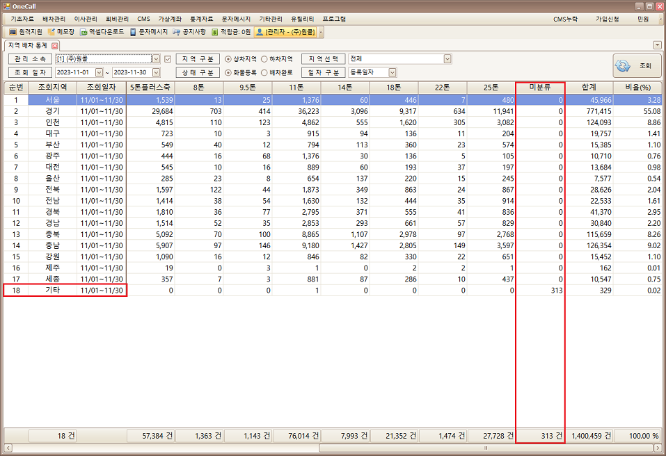 데이터 조회 시 “기타” 항목이 두건씩 조회되는 오류가 보완되었으며, “미분류” 항목이 추가되었습니다.(컬럼설정초기화 필요)