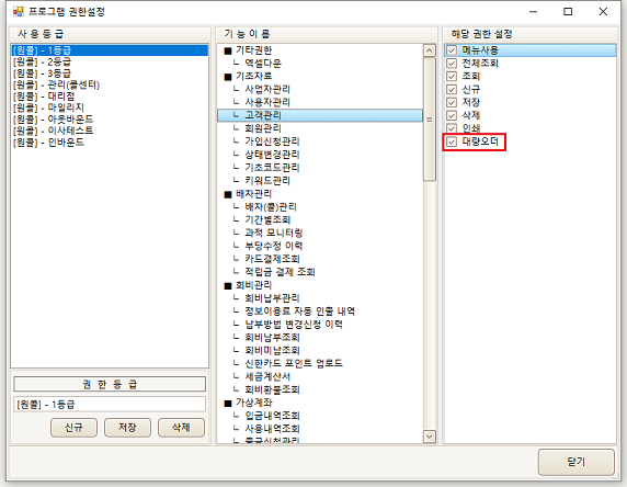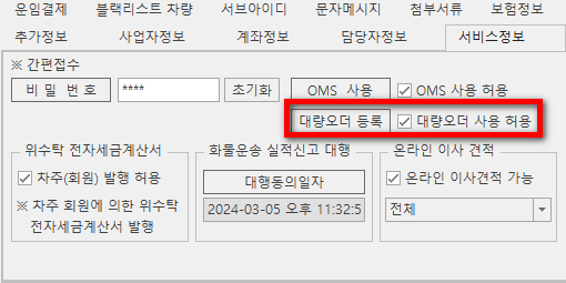 대량오더 등록 체크항목은 권한설정에서 별도의 설정을 적용해야 사용이 가능합니다.