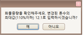 “예” 선택 시 화물중량이 최대값(110%)으로 변경되어 복사되고, “아니오” 선택 시 입력된 그대로 복사됩니다.(단, 화물중량 초과는 복사되지 않습니다.)