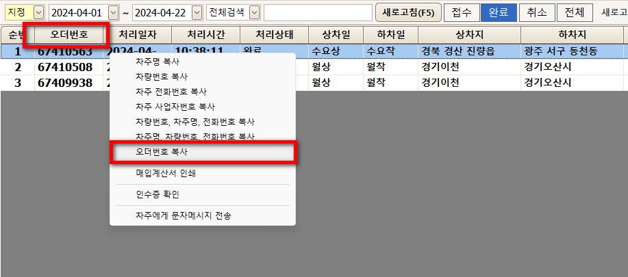 오더번호 복사하기 기능이 추가되었습니다.