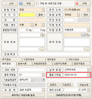 신규버튼 클릭 시 회비정보 탭의 출금시작일 데이터가 금일+1일로 기본 셋팅됩니다.