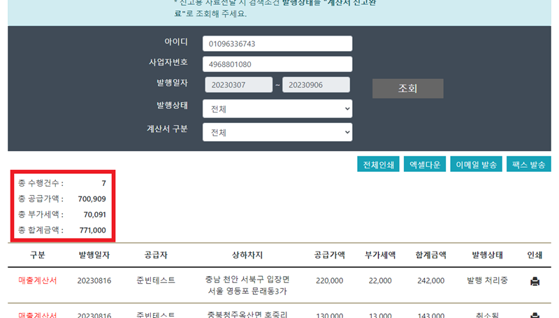 전자세금계산서 메뉴에서 상차일자와 상관없이 계산서 발행일자로 검색월의 모든 계산서를 조회할 수 있습니다.