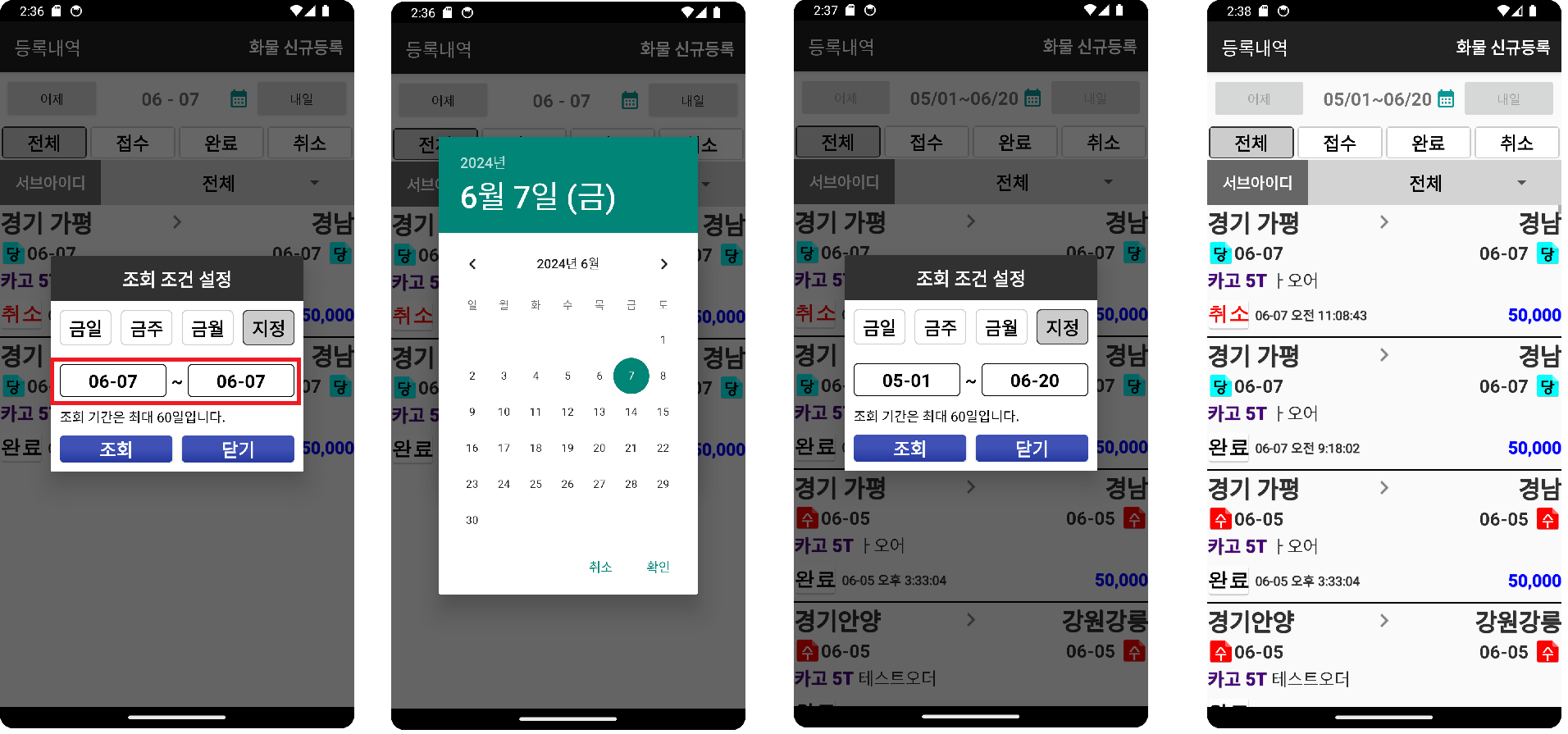 일, 주, 월, 지정기간(최대60일)단위로 조회가 가능합니다.