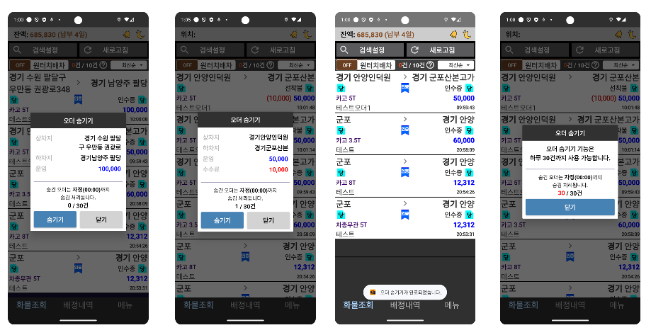 숨긴 오더는 원터치배차가 되지 않습니다.