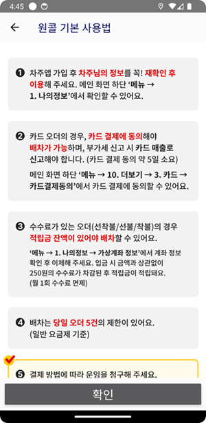 앱 설치 후 일회성으로 열람되는 이용안내 화면이 원콜 기본 사용법 화면으로 변경되었습니다.