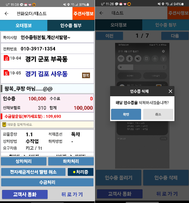 인수증 삭제 시 확인 팝업이 표출됩니다.