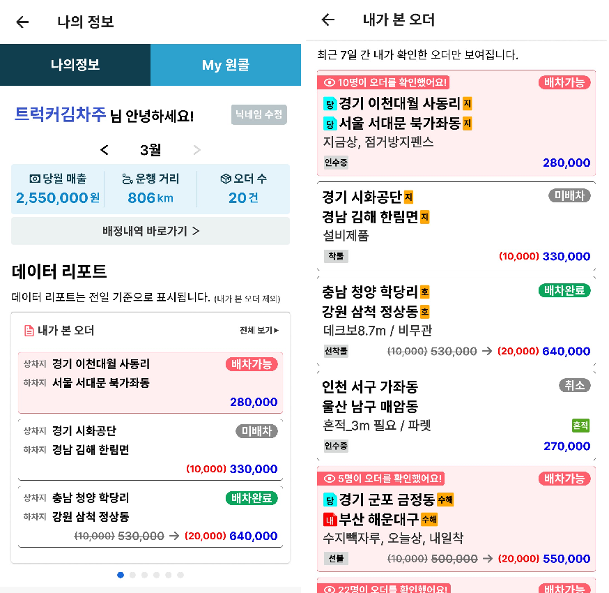 조회수: 57 차주용 앱 – Version 159.7.6 # 마이원콜 – 내가본오더 마이원콜에 내가본오더 기능이 추가되었습니다. 사용자가 이미 본 오더 목록을 확인 할 수 있습니다.