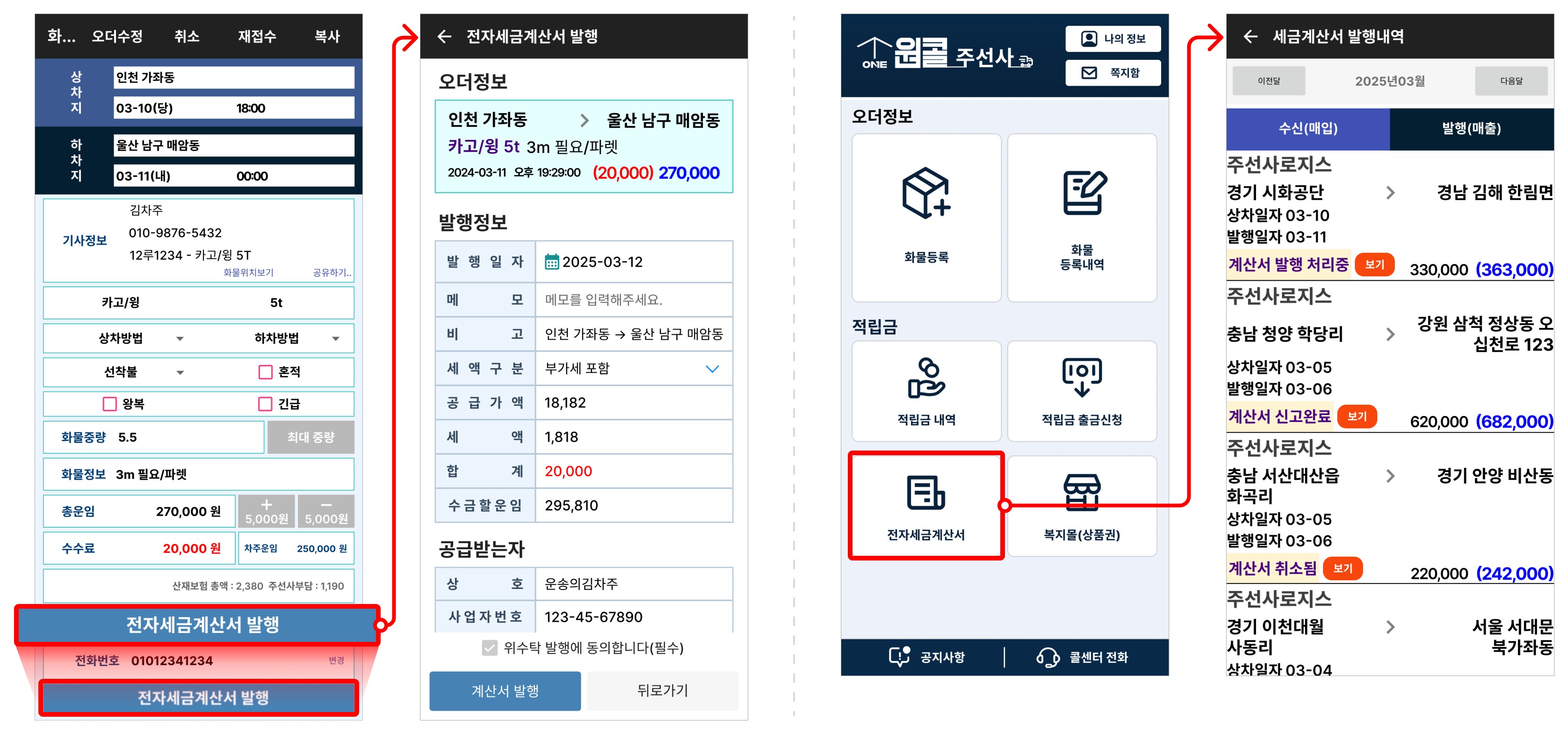 - 화물등록내역 화면에서 매입/매출 계산서 상태를 확인하실 수 있습니다.