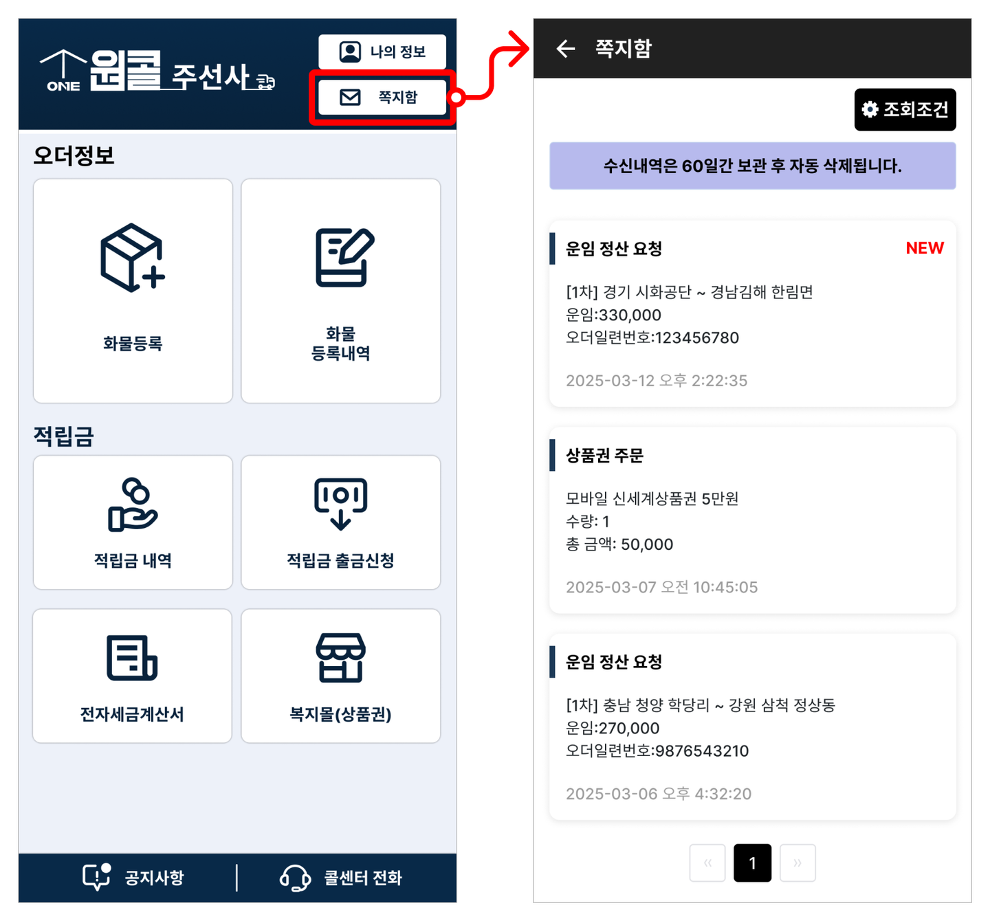 - 운임 정산 요청, 상품권 관련 쪽지를 확인하실 수 있습니다.