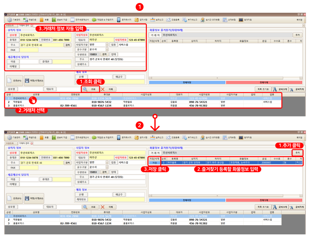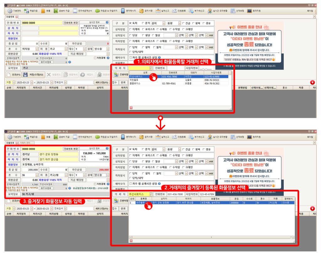 - 저장된 화물정보는 화물등록 > 의뢰자 영역에서 선택할 수 있습니다.