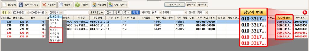 - 검색필터 추가(차주명, 차주전화, 차량번호, 담당자번호) 및 담당자 번호 컬럼 추가
