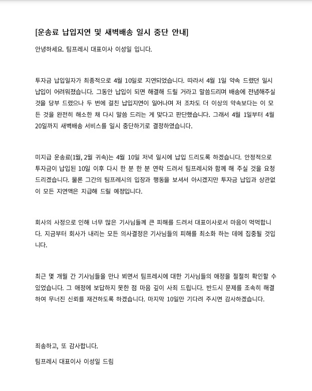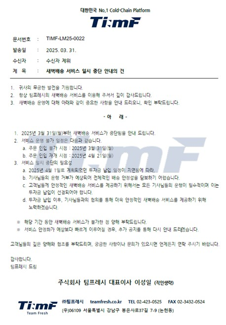 위기의 팀프레시 (운송비 납입지연 / 새벽배송 중단 공문) 2025년 03월 31일 송영규 모두의공원 조회수: 63 답글 남기기 응답 취소댓글을 달기 위해서는 로그인해야합니다. 검색