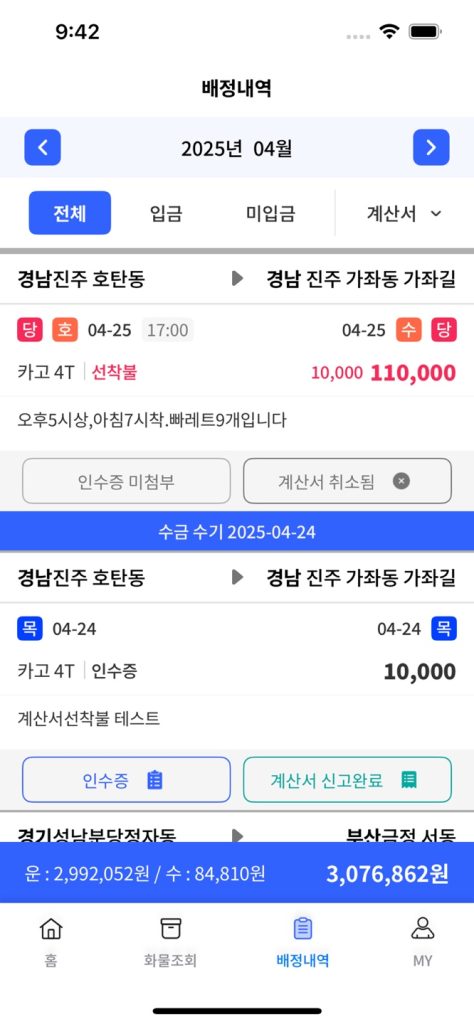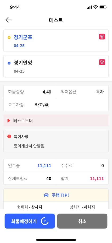 배차 완료 시에는 배정내역 리스트 및 상세 화면에서도 아이콘과 문구가 보여져요.