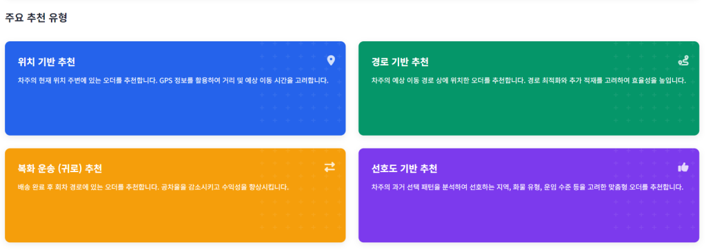 현재 위와 같은 4개의 카테고리로 차주의 과거 배차 이력 및 내가 본 오더, 찜 했던 오더등, 행동 패턴들을 각종 알고리즘 및 최신 LLM기술들을 활용 하여 학습 및 개발을 하고 있습니다.