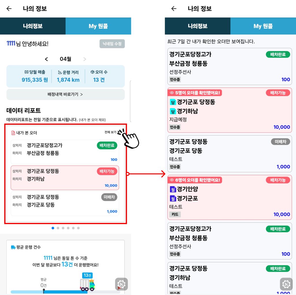 | ③ 선정 주선사 오더 | 평균 지급 일자를 기반으로 원콜이 직접 선정한 주선사 |