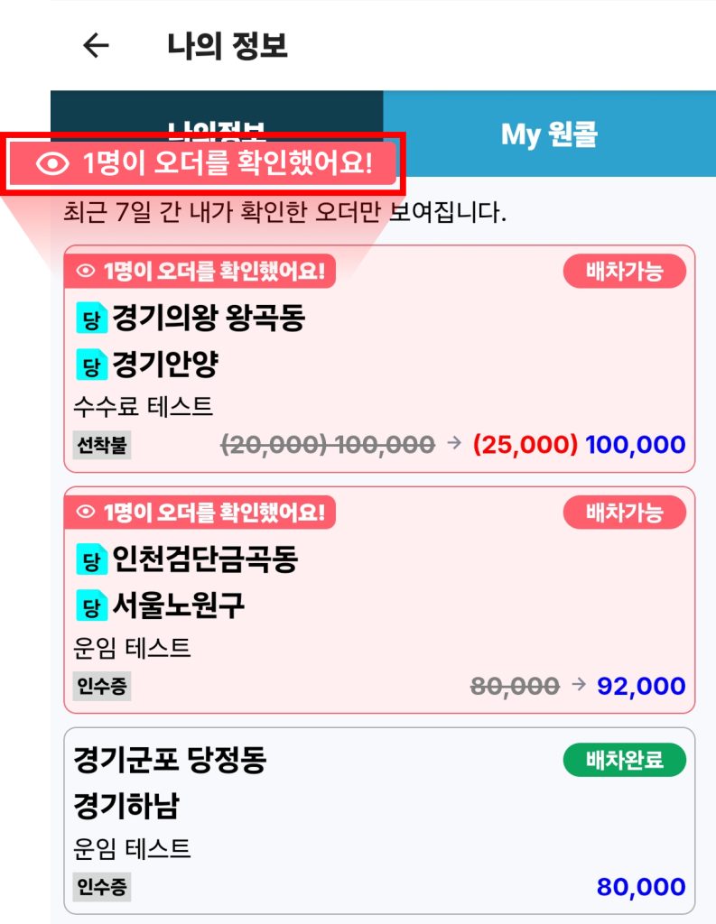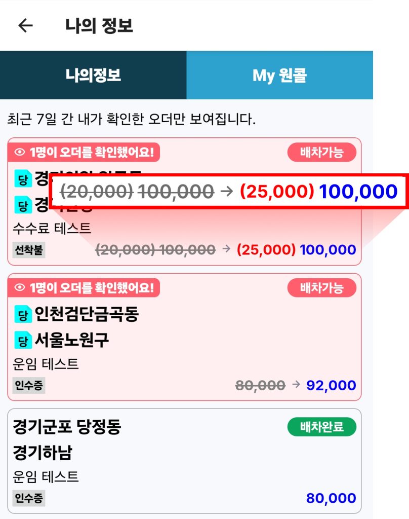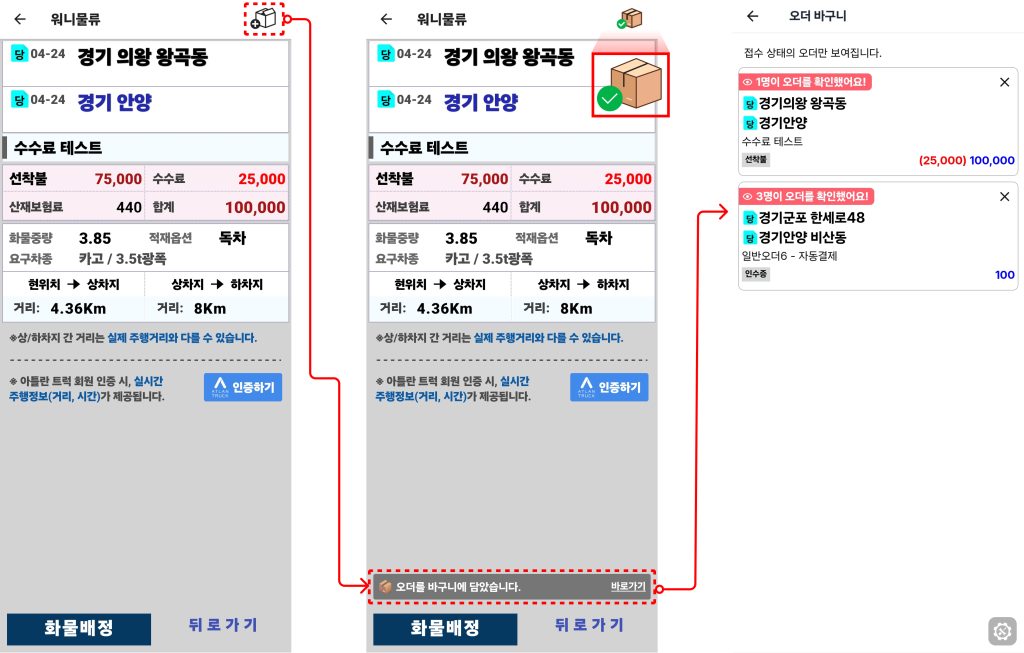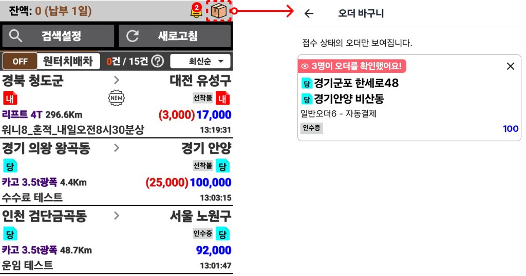 바구니 속 오더도 ‘변경된 운임’, ‘오더 확인 차주 수’ 확인이 가능합니다.