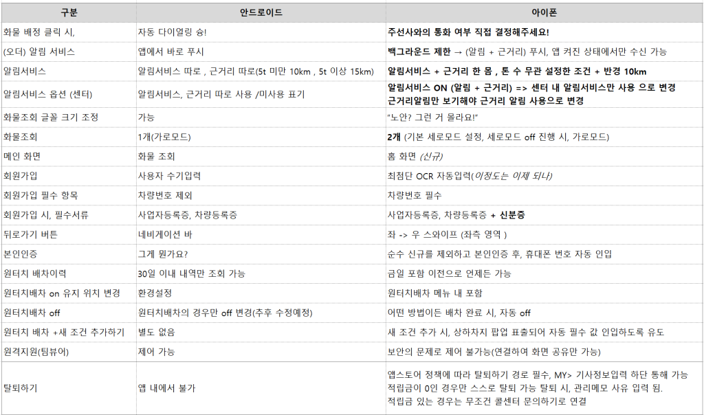 안드로이드와 아이폰의 차이 한눈에 보기 2025년 05월 21일 장원희 업무사전(FAQ) 조회수: 146 원콜 차주앱을 사용할 때 , 안드로이드와 아이폰 이런 부분은 이렇게 다릅니다. 아이폰은 os버전 17이상부터 가능합니다 (* 아이폰 11프로 이상) One comment 아이폰 구려 답글을 남기기 위해 로그인하기 답글 남기기 응답 취소댓글을 달기 위해서는 로그인해야합니다. 검색