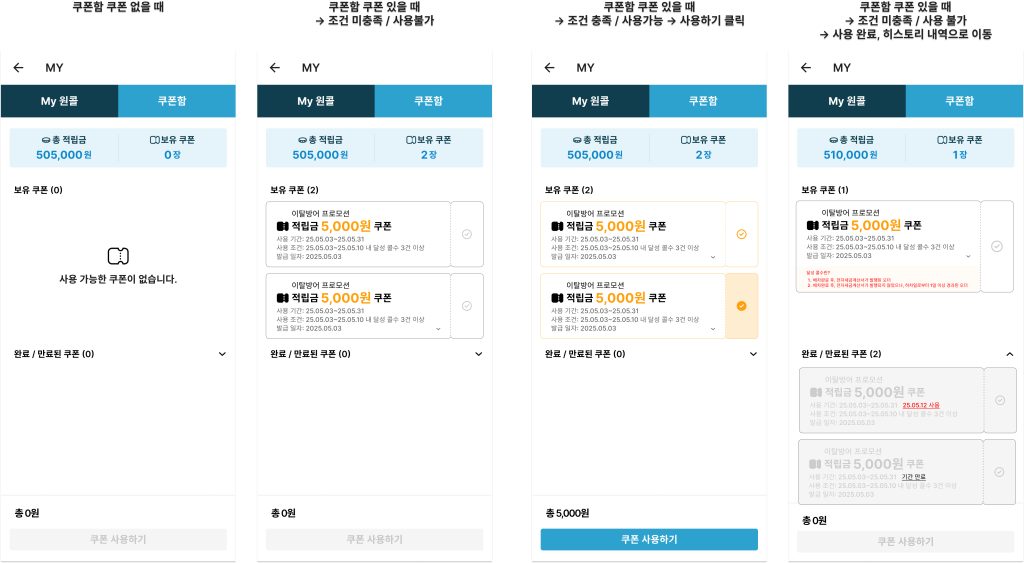 - 조건이 있는 경우, 해당 조건 완료 후 쿠폰 활성화