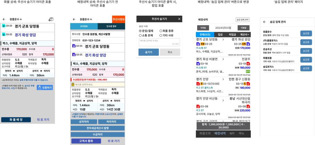 - 화물 상세 , 배정 상세에서 주선사명 우측 숨김 아이콘을 통해 해당 주선사의 오더 전부를 숨기는 기능