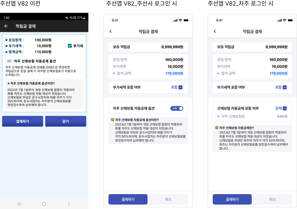 조회수: 131 안 읽은 쪽지가 있을 경우, 쪽지함 버튼에 레드닷 추가 쪽지함 진입 시, 레드닷 사라짐 (최초 1번만 보여짐) 취소오더 내용 수정 후 재접수 클릭 시, 수정된 내용으로 즉시 접수되도록 수정 적립금 결제 페이지 변경 주선사 로그인 화면과 차주 로그인 화면이 변경되었습니다. 차주 > 적립금 결제 가능하도록 추후 반영 예정