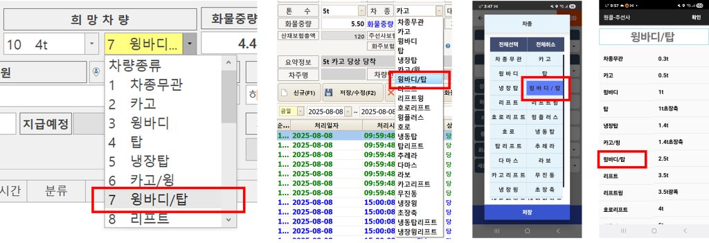 조회수: 79 공통 차종 (윙바디/탑) 추가 센터 배차관리 > 0.3t 선택 시 , 다마스 자동 선택 배차관리 > 0.5t 선택 시 , 라보 자동 선택 그 외 카고 기본 선택 (기존과 동일) 간편접수 화물등록 그리드에 의뢰자 & 의뢰자 전화번호 항목 추가 (목록 초기화 필수)