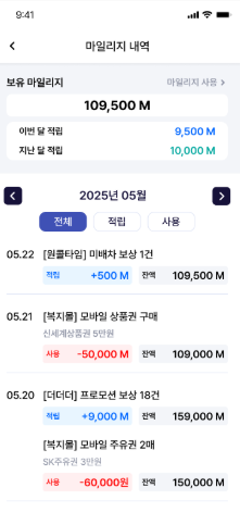 - “마일리지가 얼마나 있지? 마일리지 적립을 받았나?”