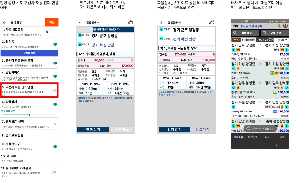 조회수: 123 주선사 자동 전화 연결 옵션 및 배차 취소 기능 추가 주선사 자동 전화 연결 ON → 화물 배정 클릭 시, 즉시 전화 연결 주선사 자동 전화 연결 OFF → 화물 배정 클릭 시, 5초간 배차취소 가능 배차취소한 오더의 경우, 화물조회 리스트 최상단으로 이동됩니다. 근거리 알림 리스트 형식으로 여러 건 보여지도록 개선 (1건 → 여러 건) 폴드 기종 화물 배정 시, 전화 2번 걸리는 현상 개선