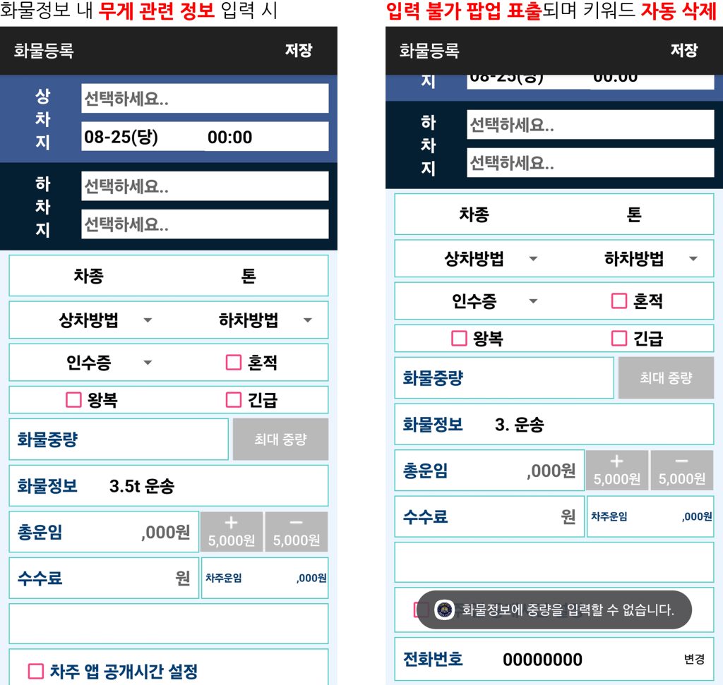 조회수: 101 화물정보 내 금지 키워드 입력 시, 자동 반영 기능 추가 무게관련 정보 입력 시, 삭제 됨 숫자 + “중”, “k”, ”K” T 관련 키워드 서브 아이디로 로그인 한 경우, 산재보험료 자동 수취 여부 옵션 수정 불가