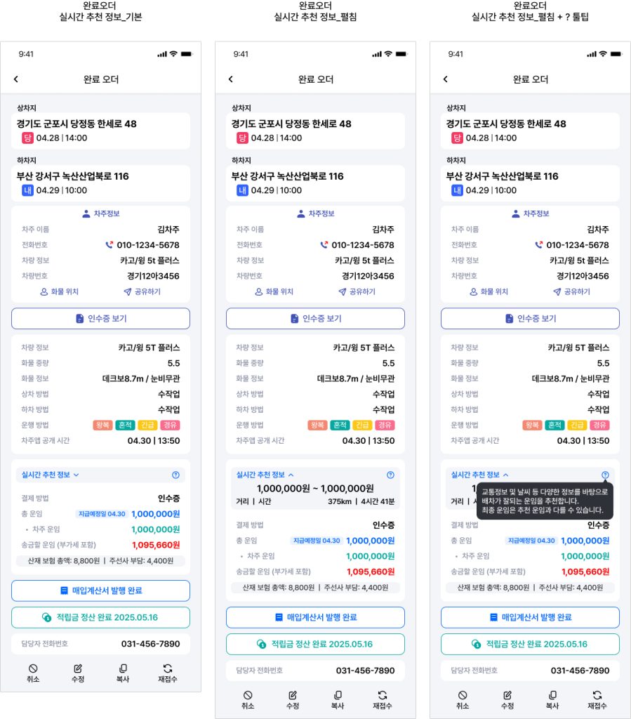 - 접수 / 완료 / 취소 오더의 경우에도 추천 운임 표기되도록 기능 추가