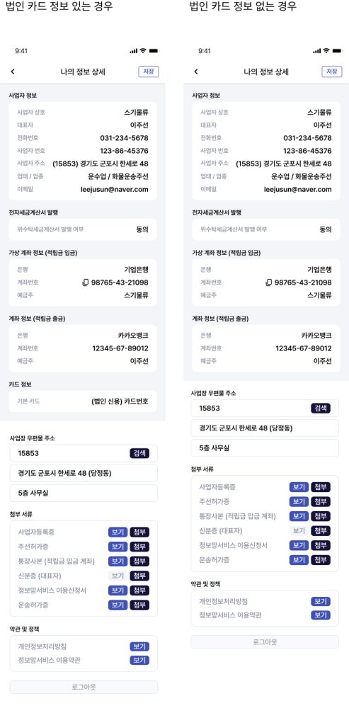 - 법인카드 정보가 있는 경우, 나의정보 에서 확인 가능하도록 영역 추가 (카드 정보 있는 경우만 보여집니다.)