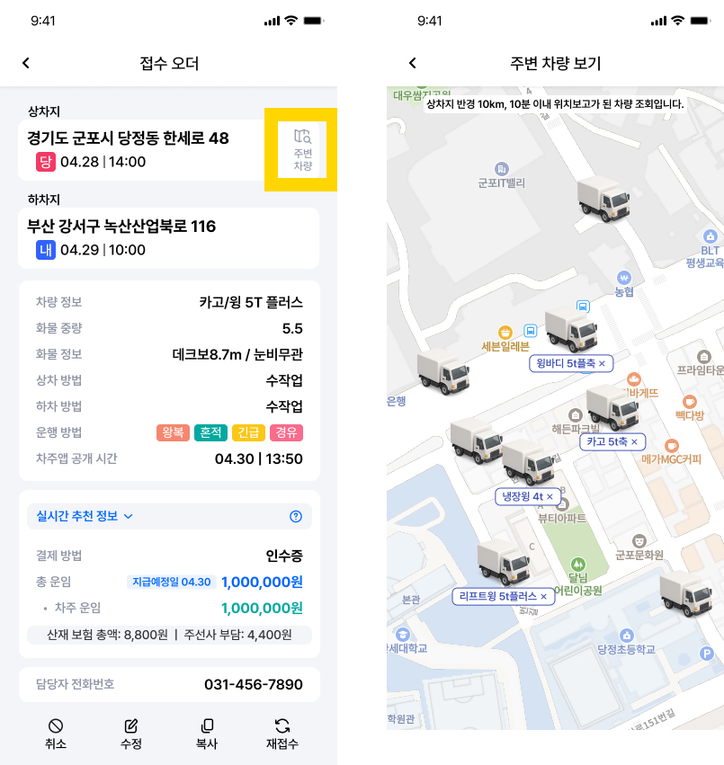 - 기존 화물 등록 페이지 내에서만 확인 가능
