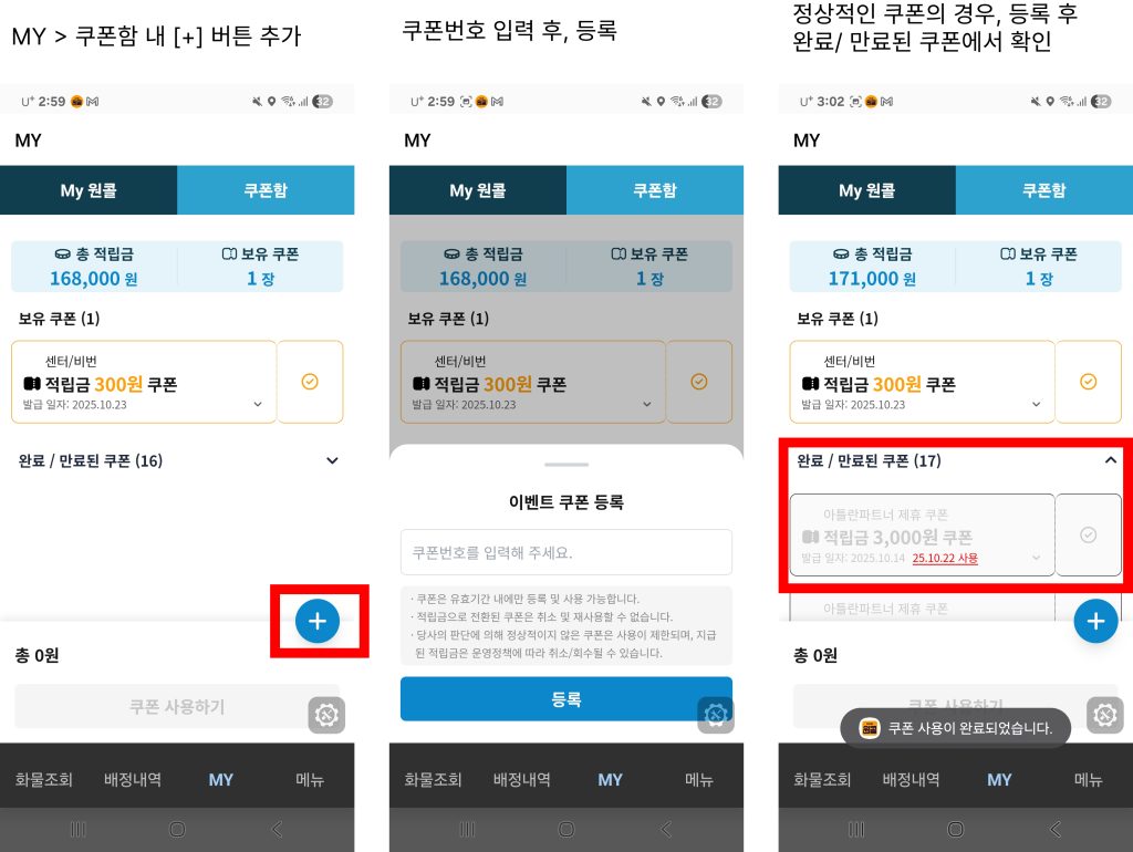- [+] 버튼 통해 쿠폰번호 입력 후, 이벤트적립금 3,000원 적립되며 완료/만료된 쿠폰 에서 확인 가능