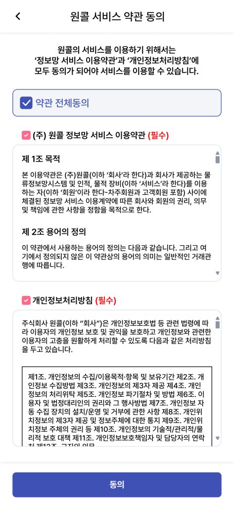 - 동의가 안되어 있다면 로그인 시점 무조건 서비스 약관 동의 페이지 표출되며 동의 후에 앱 사용 가능합니다. (주선사 로그인, 차주 로그인 동일) _최초 1번 동의 필요