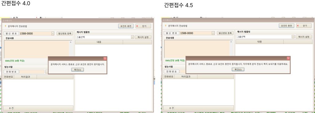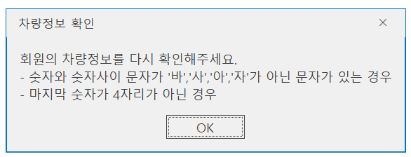 조회수: 53 센터 인수증 파일 저장 시, / 문자 _ 변경되어 저장 가능하도록 수정 회원정보 저장 시, 차량정보 체크 숫자 와 숫자 사이의 문자 1글자가 바,사,자,아 가 아닌 경우 저장 불가 마지막 문자 이후 숫자가 4자리가 아닌 경우 저장 불가 간편접수 인수증 파일 저장 시, / 문자 _ 변경되어 저장 가능하도록 수정 문자 전송 서비스 중단으로 포인트 충전 불가 팝업 표출 잔여 금액에 대해서만 사용 가능합니다.