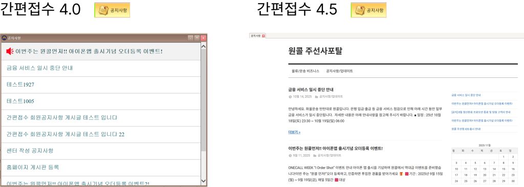 11.10 업데이트 [간편접수 4.5] 2025년 11월 10일 장원희 업데이트 조회수: 44 간편접수 4.5 공지사항 메뉴 리뉴얼 로그인 > 상단 메뉴 공지사항 간편접수 4.0 의 메뉴는 기존과 동일하게 유지됩니다. 주선사 포탈 관리 및 추가 글 작성 가능 (담당 부서 : 영업팀) 답글 남기기 응답 취소댓글을 달기 위해서는 로그인해야합니다. 검색