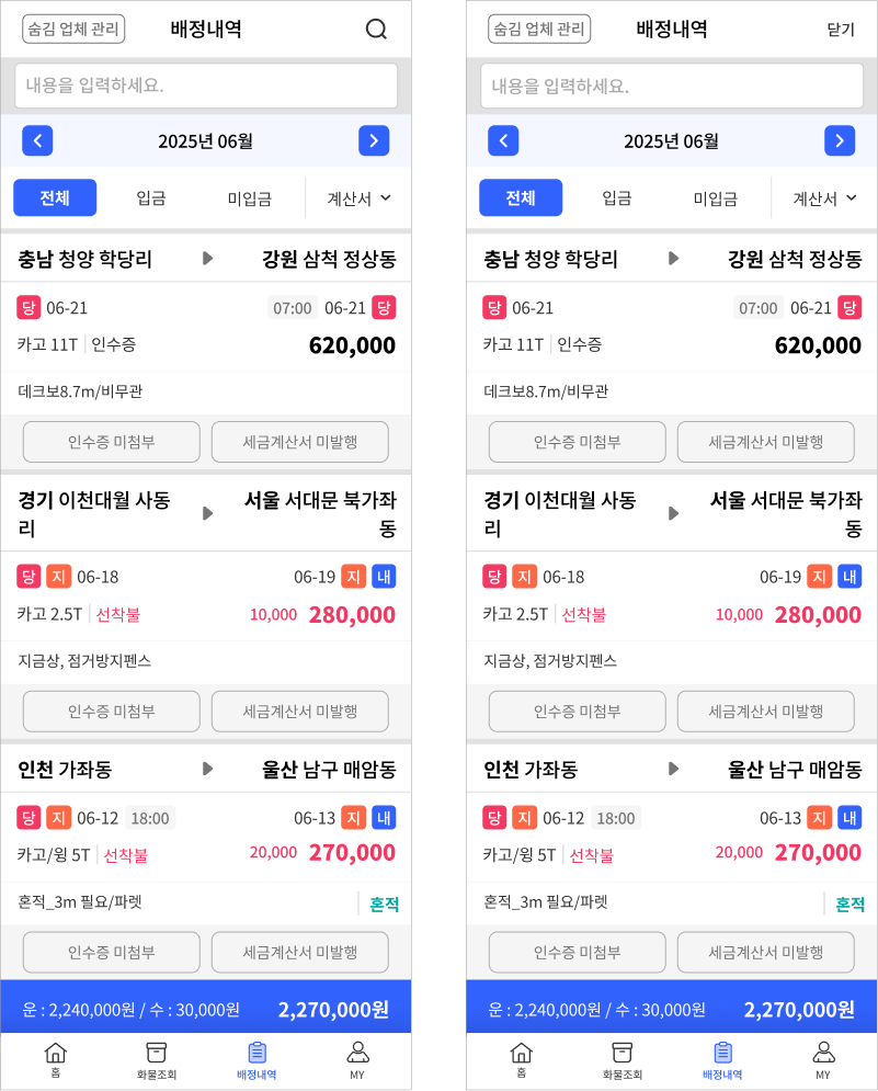 조회수: 120 배정내역 내 검색 기능 추가 검색 아이콘 클릭하여 검색 기능 추가 검색 대상 : 상차지, 하차지, 화물정보, 고객명, 오더메모 검색 진행 시, 리스트 즉시 적용 하단 금액도 반영 됩니다. 신규 페이지 딥링크로 이동하도록 추가 스티커 인증 상세 ONE 혜택 쿠폰함 화물조회 느려지는 현상 개선 화물조회 > 새로고침 바 감도를 수정하였습니다.
