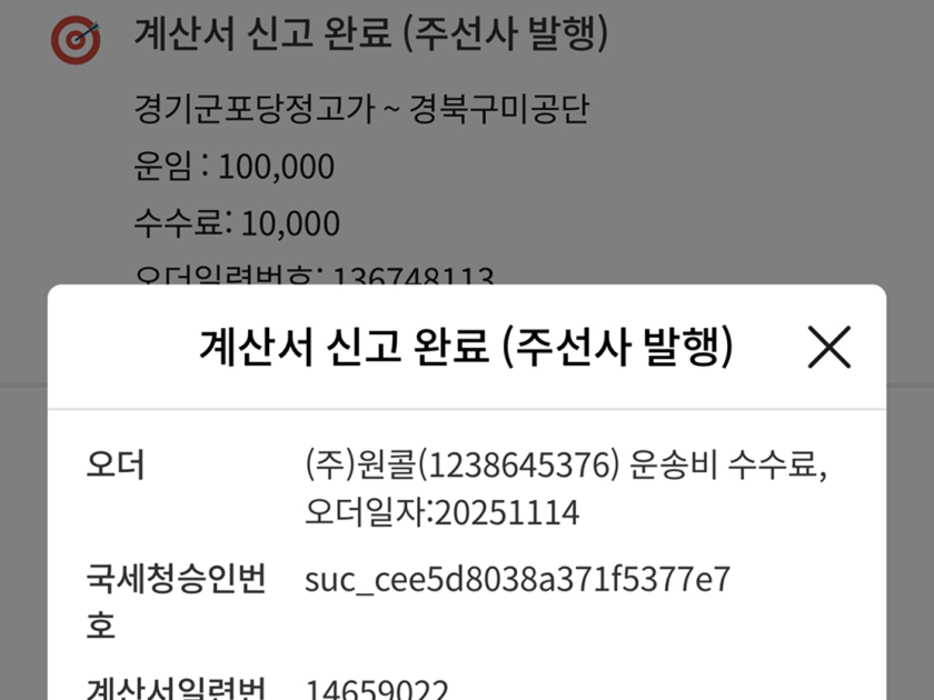 쪽지함 > 전자세금계산서 신고완료(주선사 발행) 쪽지 내 오더일자 추가